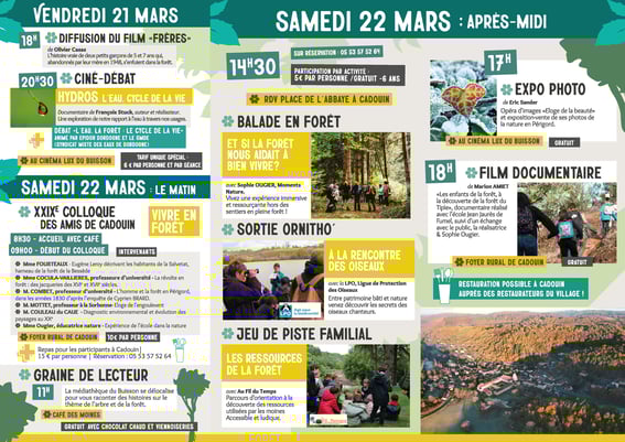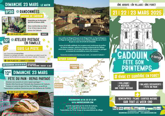 Le XXIX Colloque des Amis de Cadouin "vivre en forêt" se déroulera le 22 mars 2025 à partir de 9h au foyer rural de Cadouin. L'après midi différentes ballades accompagnées en forêt seront proposées